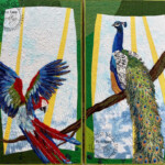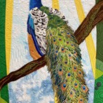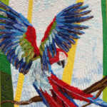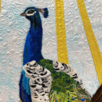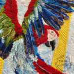This project is a custom commission for a client. Her space and desire for a pair of quilts dictated some of the sizing and design decisions. She requested both a peacock and parrot of some kind that “had red”, to fit in her space with the ultimate goal of framing them in gold victorian wood frames to match her home. After careful measuring and examining the colors of her home we agreed on a plan to create a diptych of two birds on a single branch. While these two birds are from different continents, it is my feeling they are old friends, partners in mischief in an aviary of sorts.