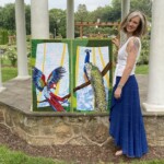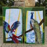 I chose the Green Wing Macaw over many other colorful parrots, as I was able to coordinate some of the yarn choices between the birds, making them flow better. Also, as one of the largest of the macaw family, the green wing could hold its own against the majestic peacock. Peacocks are a ground bird, but my client wanted a cascading tail…and they do, in fact, roost in trees.