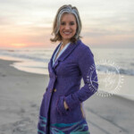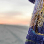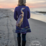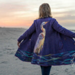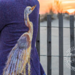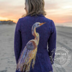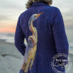The jacket itself is a lovely vintage thrifted fit and flare. Originally it was a marled pink wool, that I overdid with cobalt wool dye to create this purple. The “water” is hand dye wool roving that was needle felted into place along the hem.