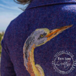 The long mating plume feathers are made of hand painted eyelash yarn, carefully controlled and left loose on the original bird yarn couching before applying it to the jacket, then sewn down during the application process.