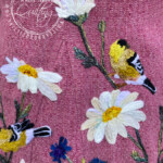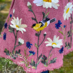 This jacket is a commission piece, requested after I completed my original Meadow Walk jacket with bluebirds. I had agreed to do the piece, on the condition I could change the birds and flowers and make it feel similar but not the same. After consultation, my client was moved by the idea of goldfinches, daisies and bachelor button wildflowers, all of which have significance to her. It was while making some goldfinches as a test piece that I was inspired to create my own green goldfinch jacket (seen in a different post).