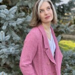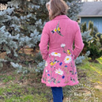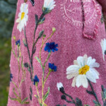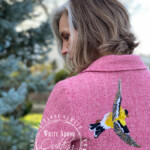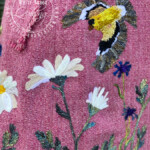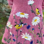 This swing coat is a pink tweed and has 5 goldfinches nested in the flowers. The daisies feature as many as 8 subtle shades of white in the petals. Some of the bachelor buttons have tufted centers. All the elements are freemotion machine yarn couching. Some parts are created like appliqué, others are sewn directly on the coat.