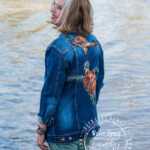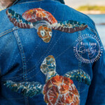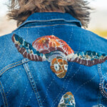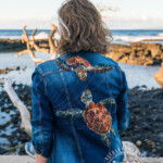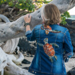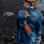 I was really fortunate to spend Christmas in Hawaii this year. I made this jacket specifically for the trip with a thrifted long denim. The yarn couched green sea turtles (Honu) are sacred in Hawaii and I was thrilled when one decided to visit me on the black sand beach, in addition to letting me hang out with them while snorkeling one day! The big stitch quilt lines detail was meant to imply the layers of ocean water and light and were made with a sashiko sewing machine, that mimics hand stitching.