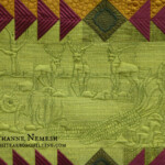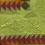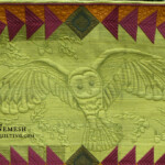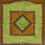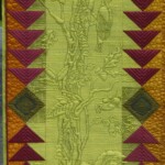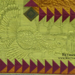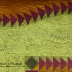 This is the third in a series of silk dupioni quilts done in my pictographic quilting style. I love everything about a Pennsylvania fall … the colors, the smells, the harvest and all the busy critters. With this quilt, I tried to capture that feeling using all original hand drawn motifs that are free-motion quilted. The beaded details are tiny applique tubes individually stuffed with beads and hand tied off. The center medallion and binding feature handmade beaded piping. Derwent Inktese pencils were used on parts of the quilt to create shading.