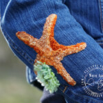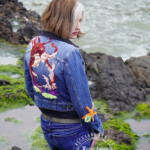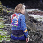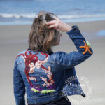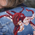 A recent trip to the wild Oregon coast inspired this classic denim coat. The red octopus, coral, green anemones, purple urchins, and orange starfish are all part of the small wonders you can find in a rocky tide pool on a lucky day while exploring. On this jacket, the green anemones feature tufting as well as yarn couching. The piece was yarn couched on a layer of tulle and wash away stabilizer before appliquéing by machine to the denim.