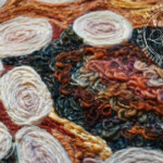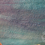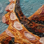 This 23 x 24″ piece is my submission to this year’s International Quilt Festival, Houston’s celebrity auction. It features artisan hand dye fabric, hand guided free motion machine quilting, and yarn couching with all artisan yarns in a variety of fibers ranging from wool to silk and everything in between. It will be available for silent bidding at the show, and is only the third piece of art I have made that Ive chosen to part with to date.