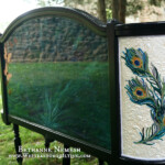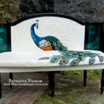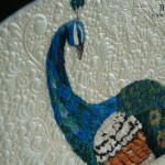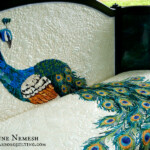 Ive been saving this headboard for a long time with the idea of making a bench of some kind out of it. Not long ago, I began falling in love with yarn couching and the idea to have a regal peacock draped across the back and seat was born. This piece will eventually be sold, after exhibit at Quilt Odyssey, 2018 and AQS Lancaster 2019 in special exhibits featuring my work. The upholstery is quilted pearlized vinyl and the yarns represent a variety of artisan yarns including silk, wool, alpaca and others.