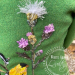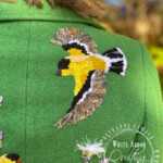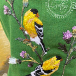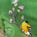 This beautiful green wool jacket and goldfinches were a perfect pair! I enjoyed creating this, as the fluffy seed head thistles and the fine white feathers on the birds were a particular challenge. The birds were created as appliqué elements, yarn couched on my domestic machine using a hoop, wash away stabilizer and tulle. The floral elements were created by doing the yarn couching directly onto the jacket, again with my domestic machine. I wore this coat for the first time to the Houston International Quilt Festival award ceremony…where it had good luck…as I won!